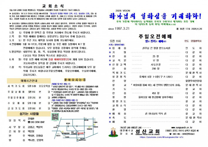 2026-04-24 | 안산성산교회 | 금요기도회 | 사자의 포효를 잠재우는 영원의 메아리
